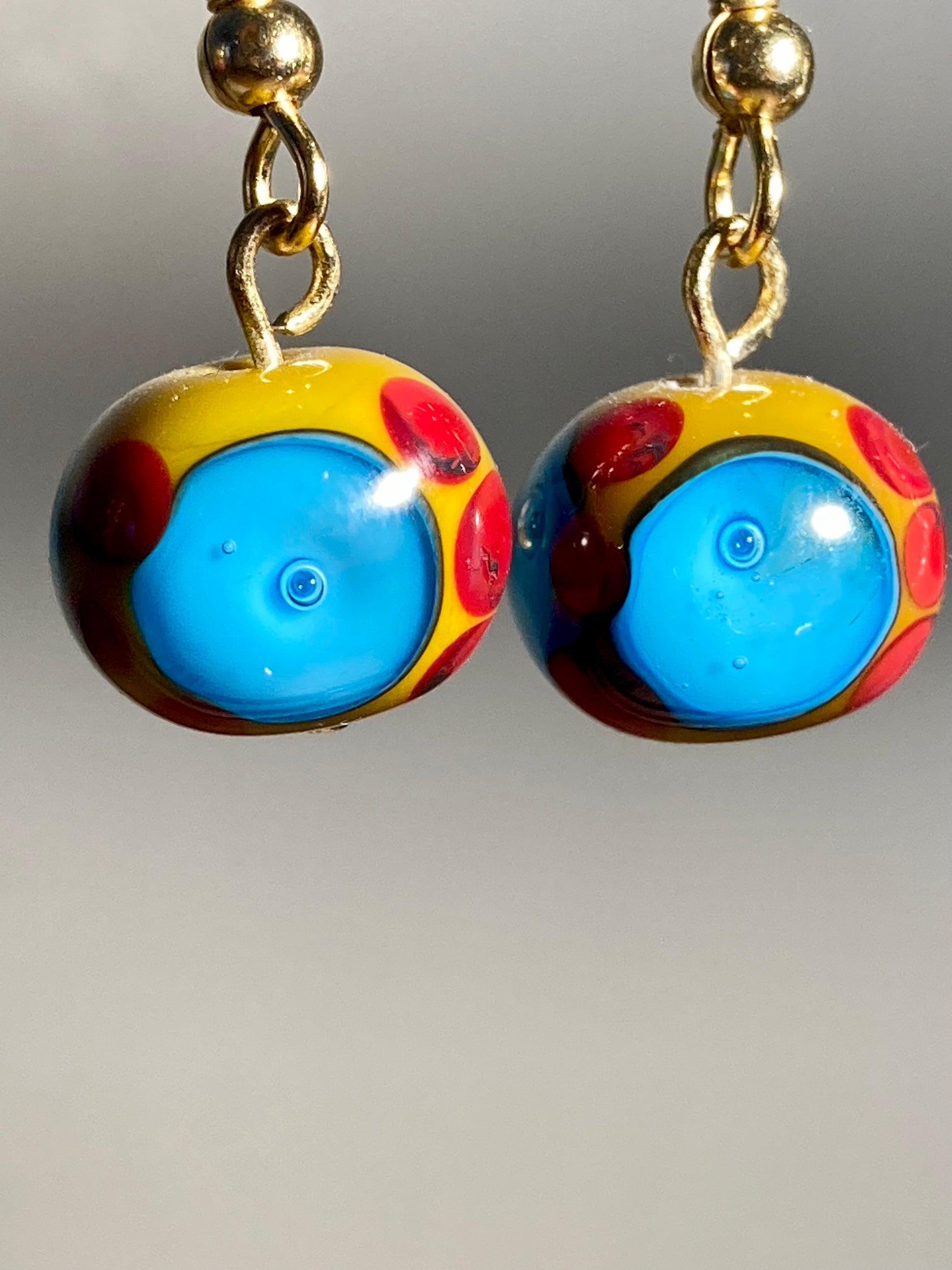 Ajoutez de la fantaisie à vos oreilles avec nos boucles orange à pois bleus et rouges. Les perles en verre de murano filé orange et les petits points décoratifs rouges, ainsi que les bulles ajoutées au centre des pois bleus, donnent une touche unique. C'est parfait pour un look décontracté et amusant !
