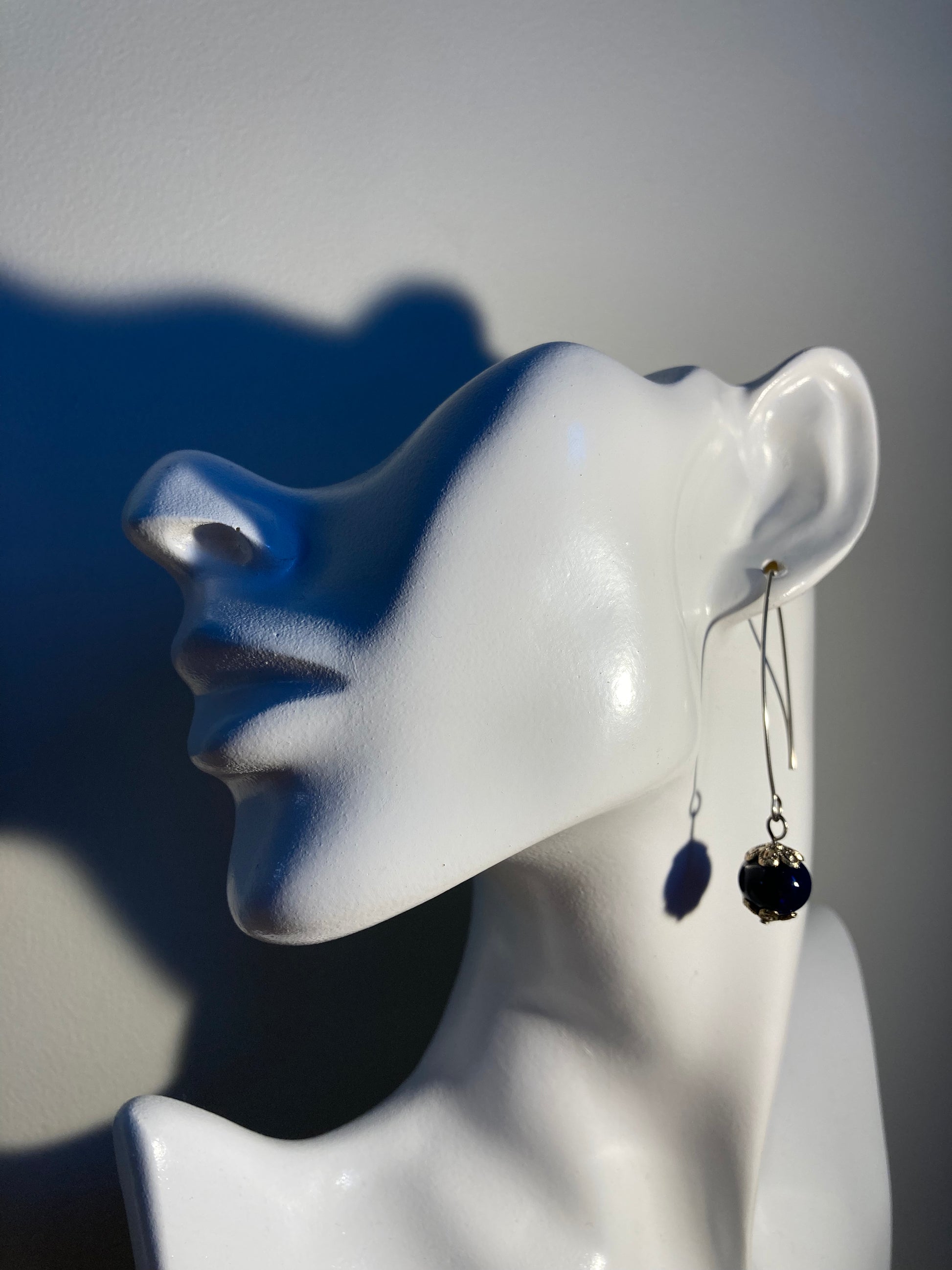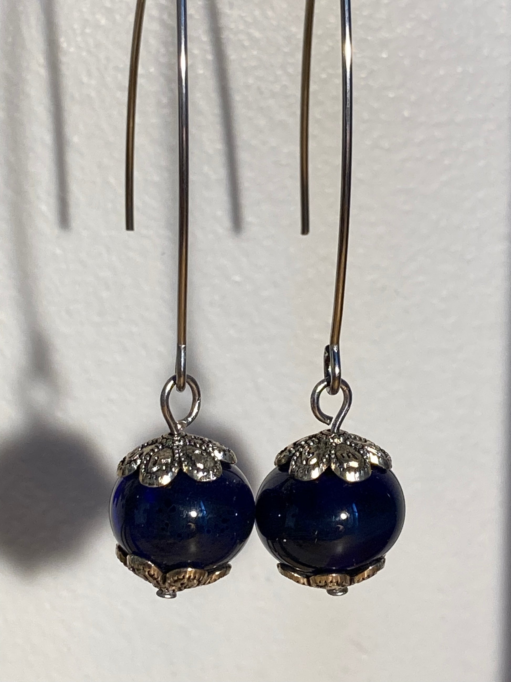 Boucles d'oreilles composées d'une perle en verre de Murano bleu marine opaque entourée de 2 corolles, le tout accroché à un apprêt long en inox.