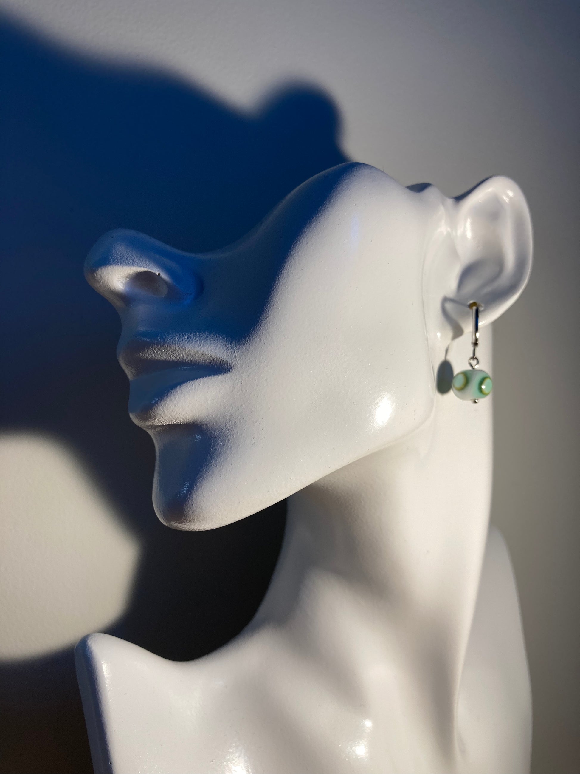 Boucles d'oreilles composés d'une perle blanche en verre de Murano avec des superpositions de pois verts et bleus.