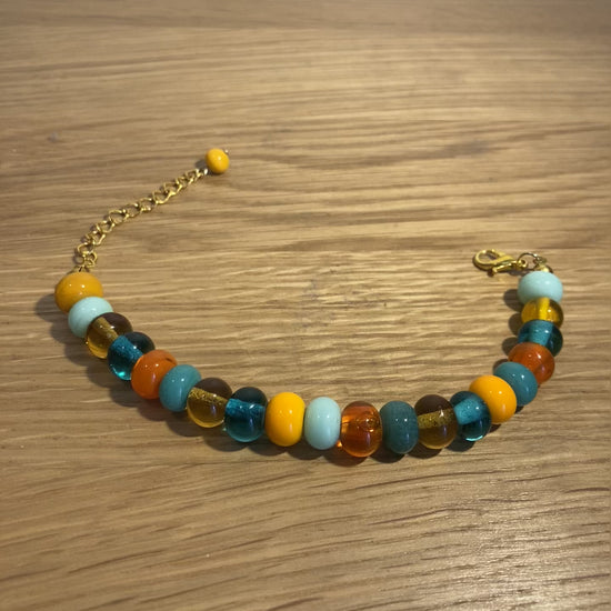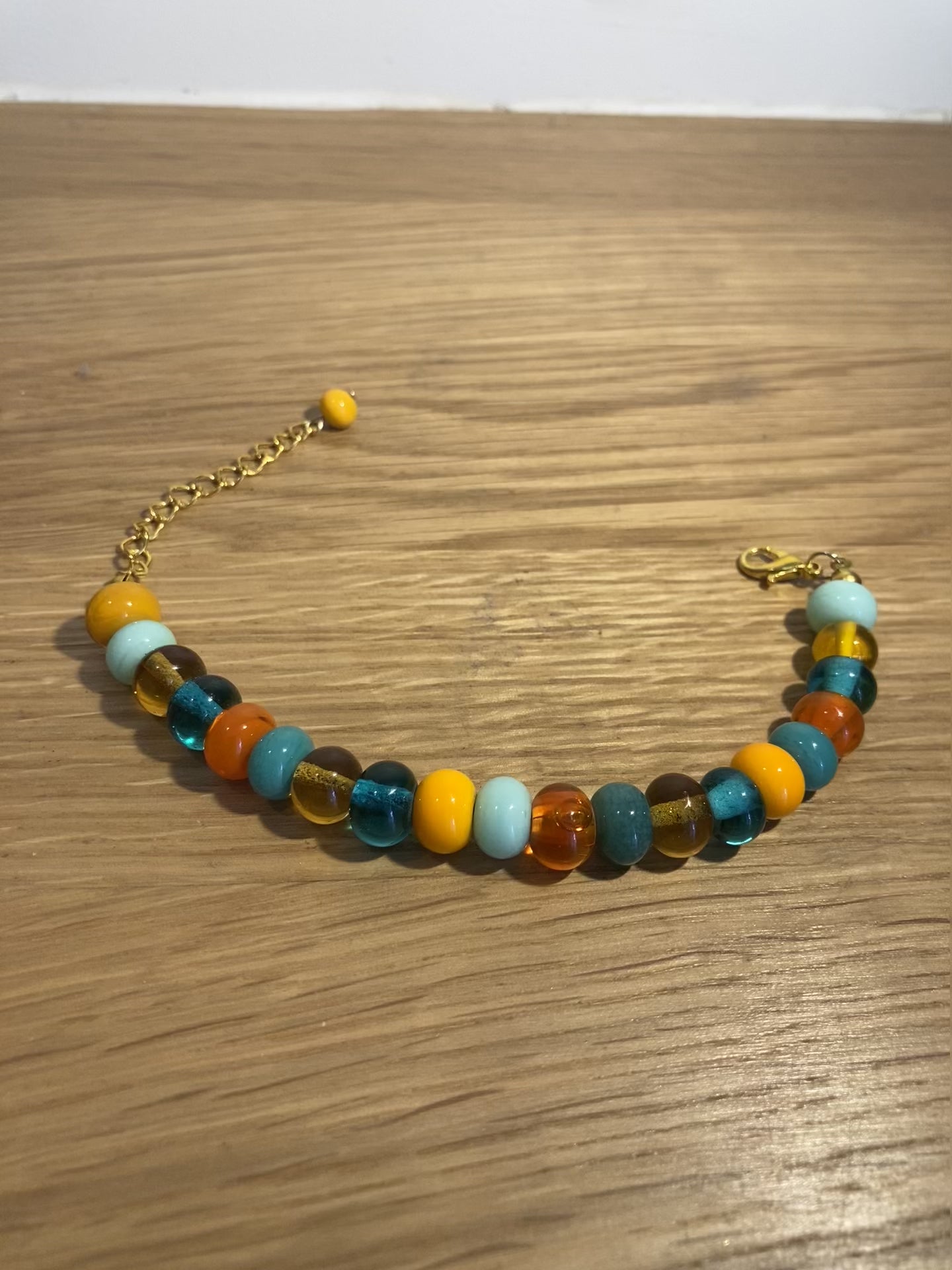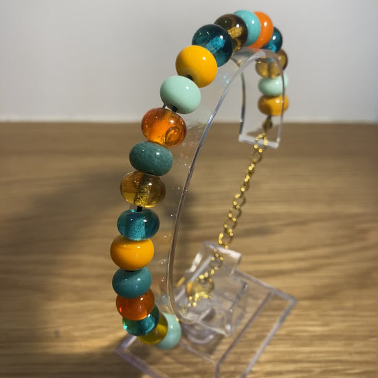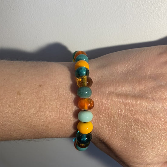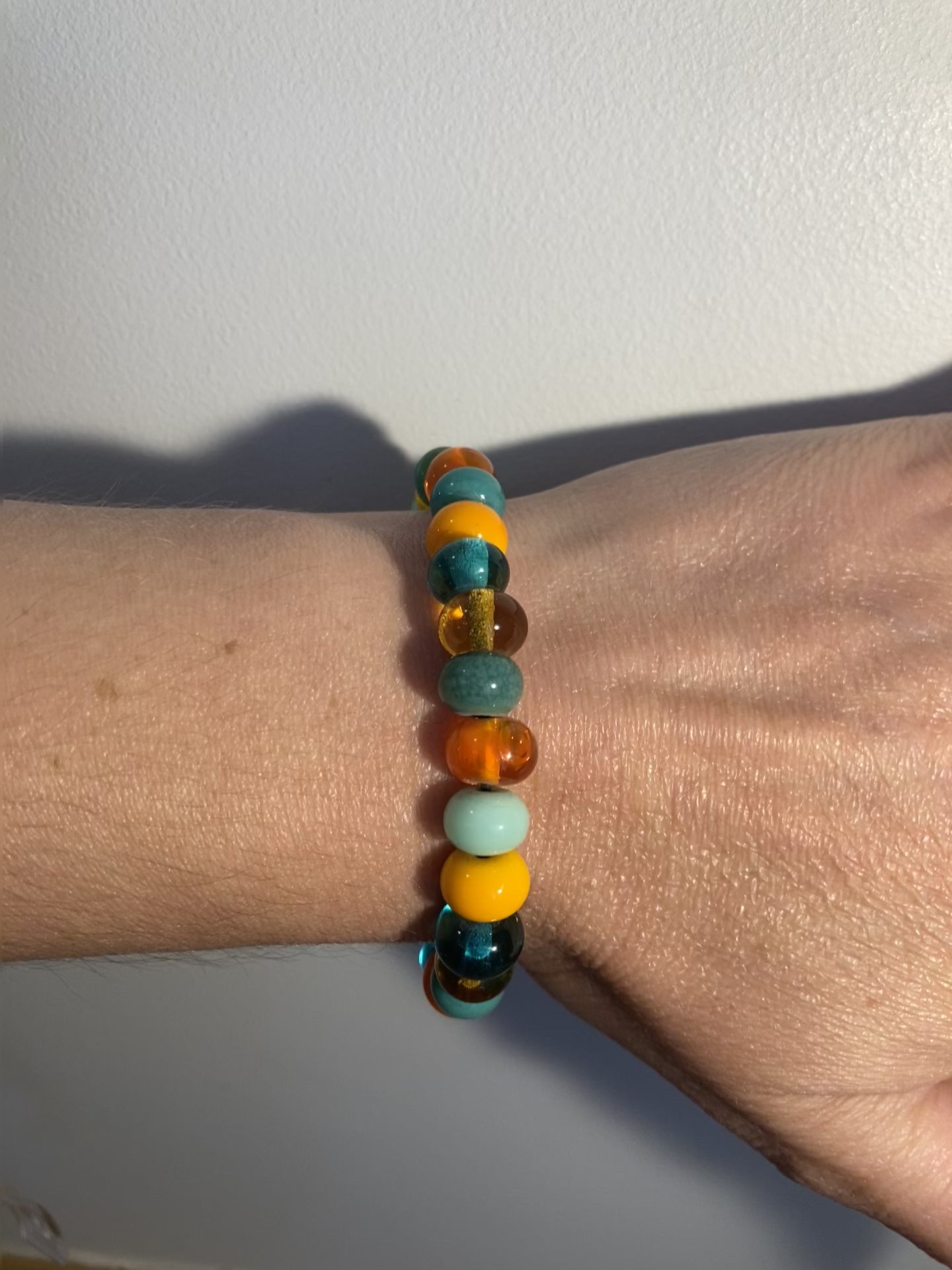 Ce bracelet composé d'une vingtaine de perles de Murano joue sur un mélange de couleur orange-vert et sur la transparence du verre.