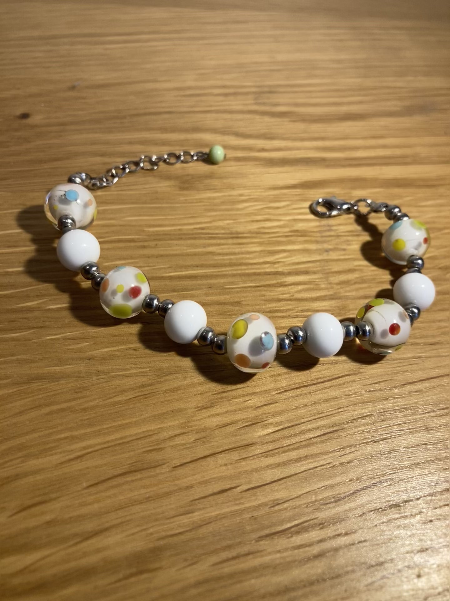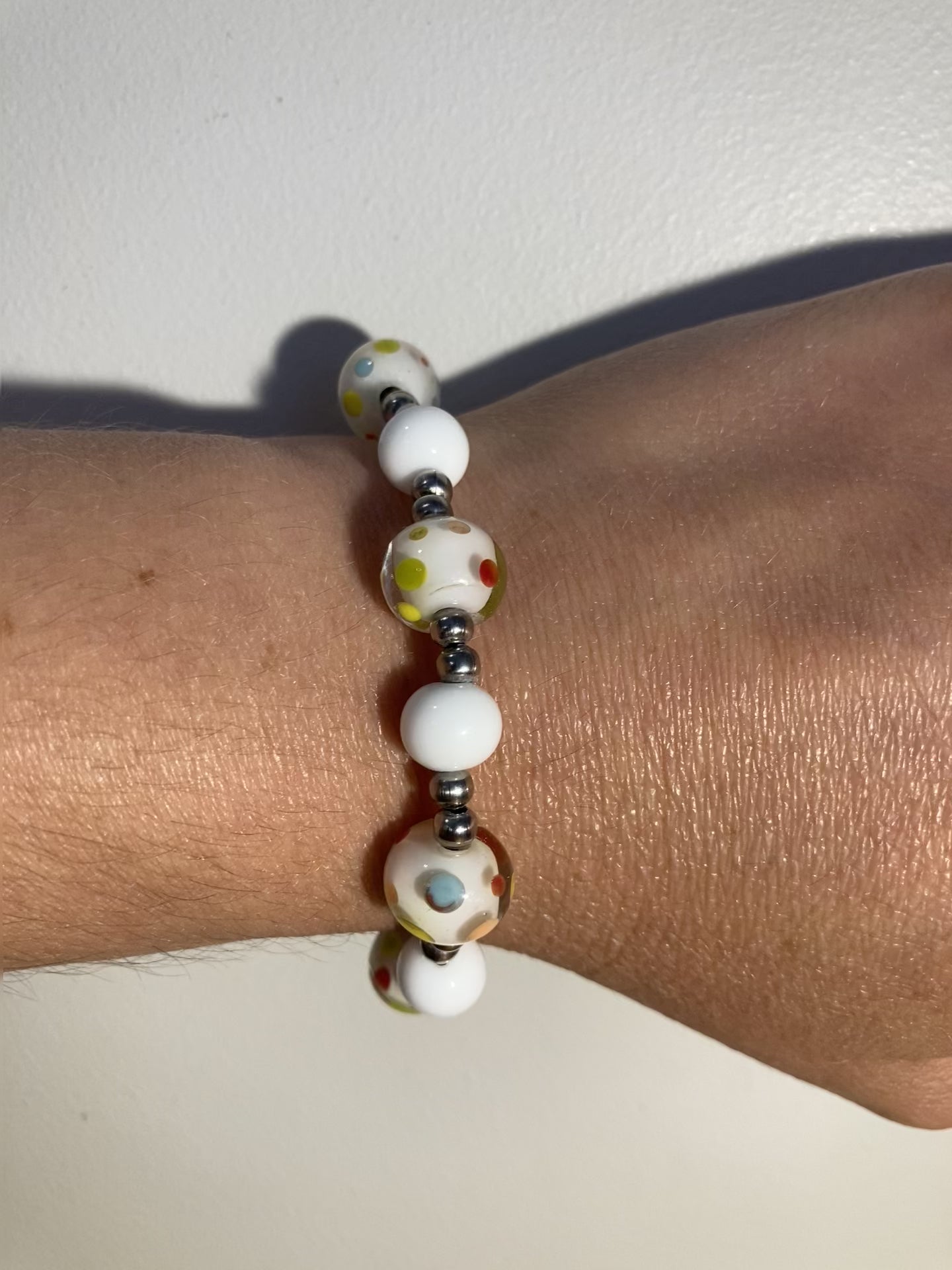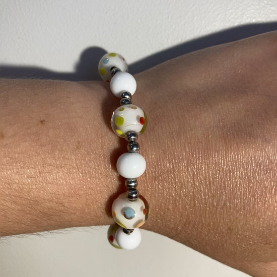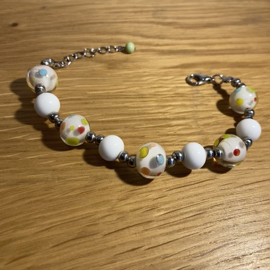 Ce bracelet associe 4 perles de verre blanches à 5 perles blanches à pois multicolores, montées sur un élastique solide. Sa chaîne en inox réglable assure un ajustement parfait, pour un accessoire coloré et joyeux qui égaye toutes vos tenues.