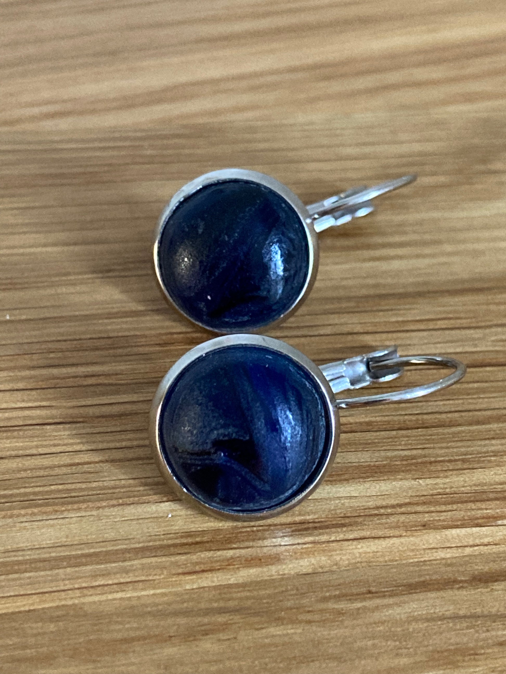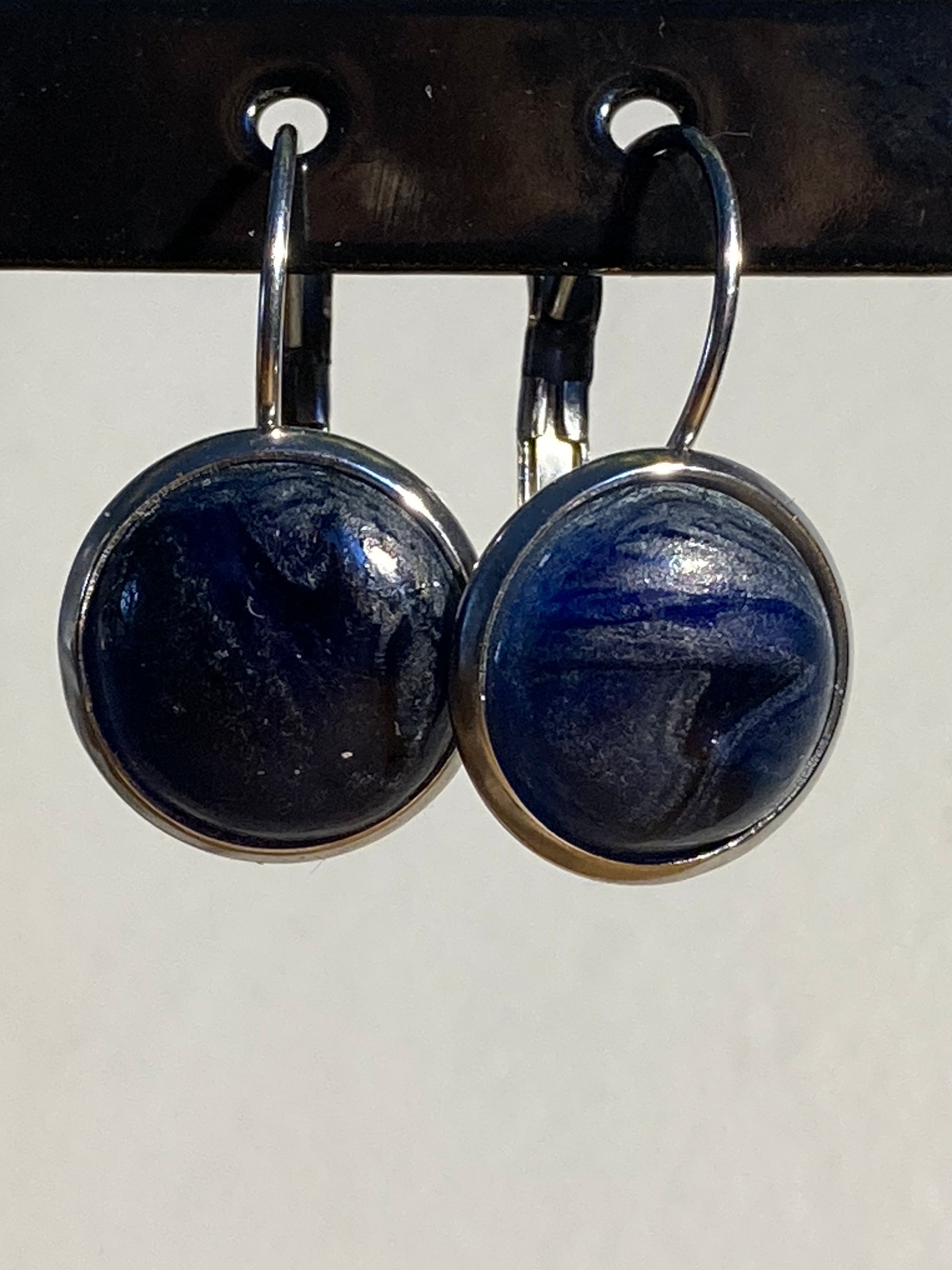 Boucles d'oreilles en vitrail fondu bleu marine opaque dépoli à effet marbré.