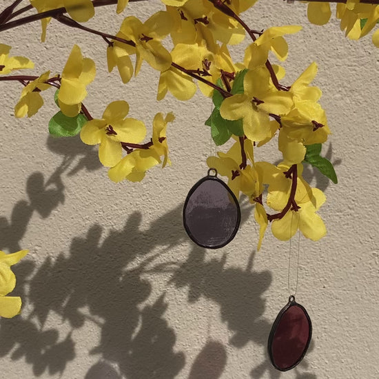 Ce produit est une décoration en forme d’œuf en vitrail rose foncé, parfaite pour suspendre et ajouter une touche unique à vos festivités de Pâques !