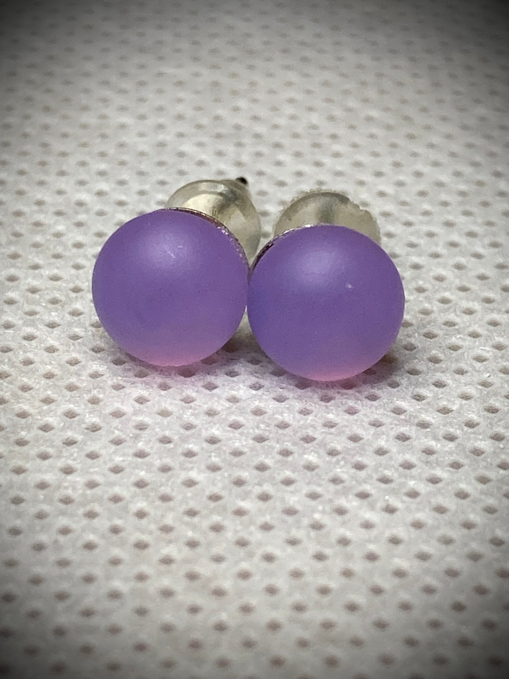 Puces d'oreilles violettes effet givré ( verre de Murano dépoli) sur tige en inox.