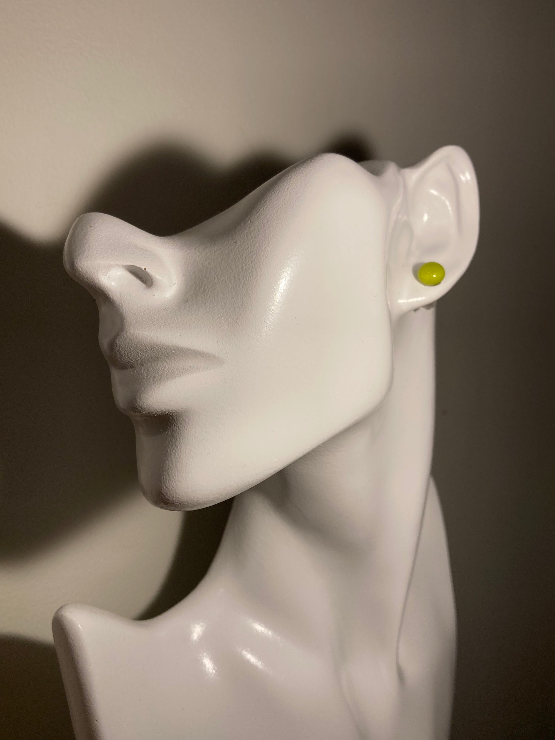 Puces d'oreilles opaques en verre de Murano transparent, de couleur citron vert, montées sur des tiges acier inoxydable.