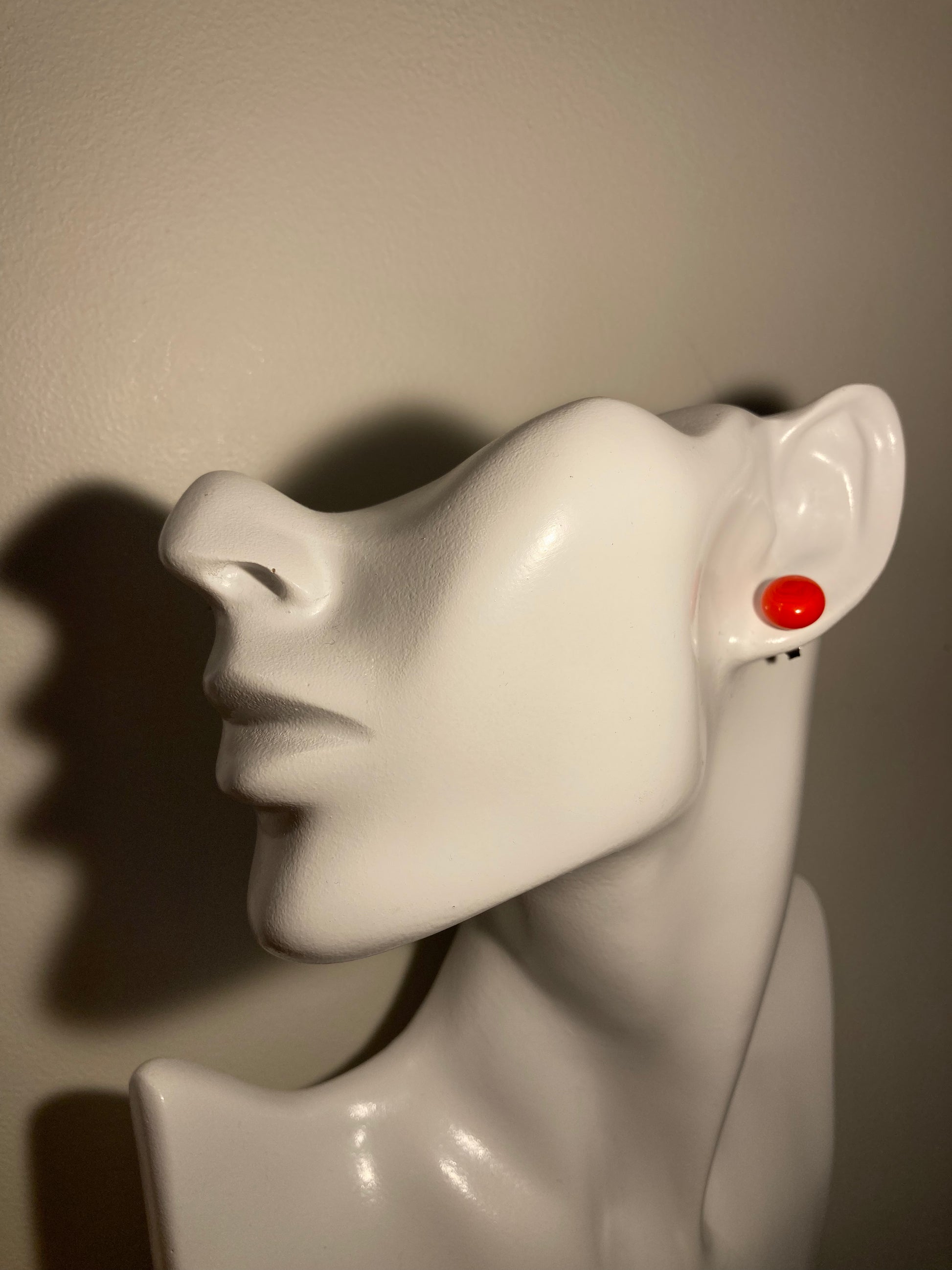 Ces puces de grande taille en verre de Murano opaque orange avec cercles en cibles irrégulières sont montées sur des tiges en inox hypoallergénique.