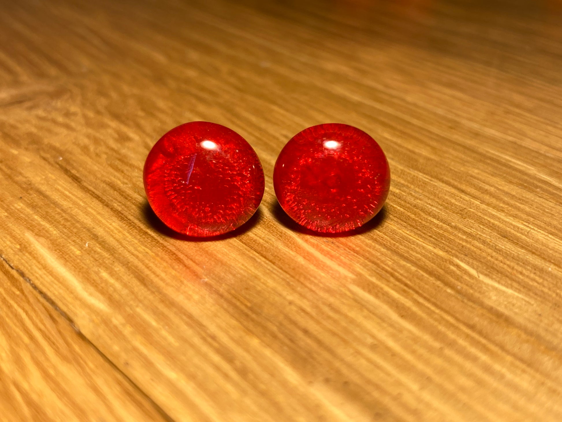 Ces puces de grande taille en verre translucide orange avec effet bulles sont montées sur des tiges en inox hypoallergénique.