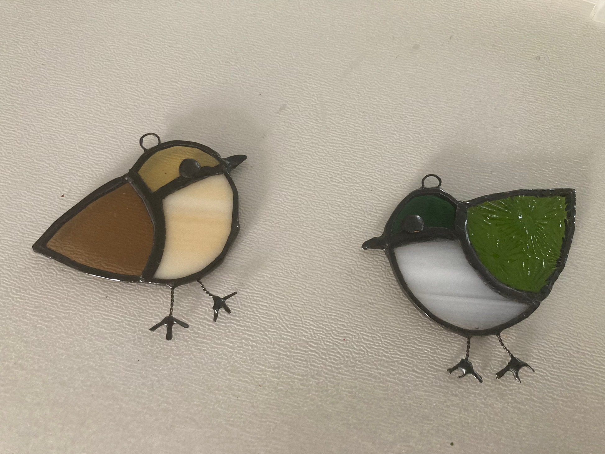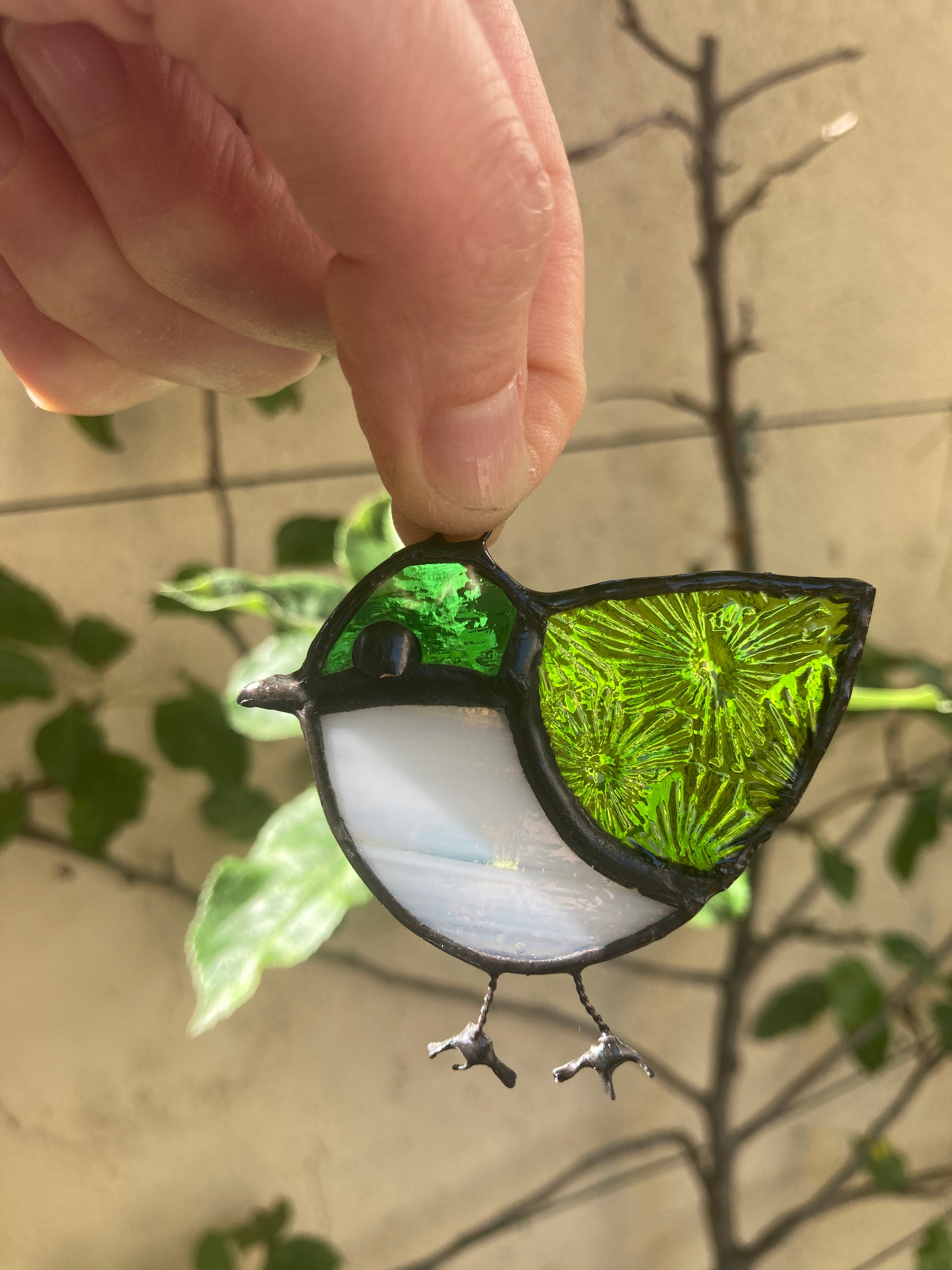 Petit oiseau en verre aux nuances de vert et blanc. Son aile vert pomme affiche un effet texturé.
